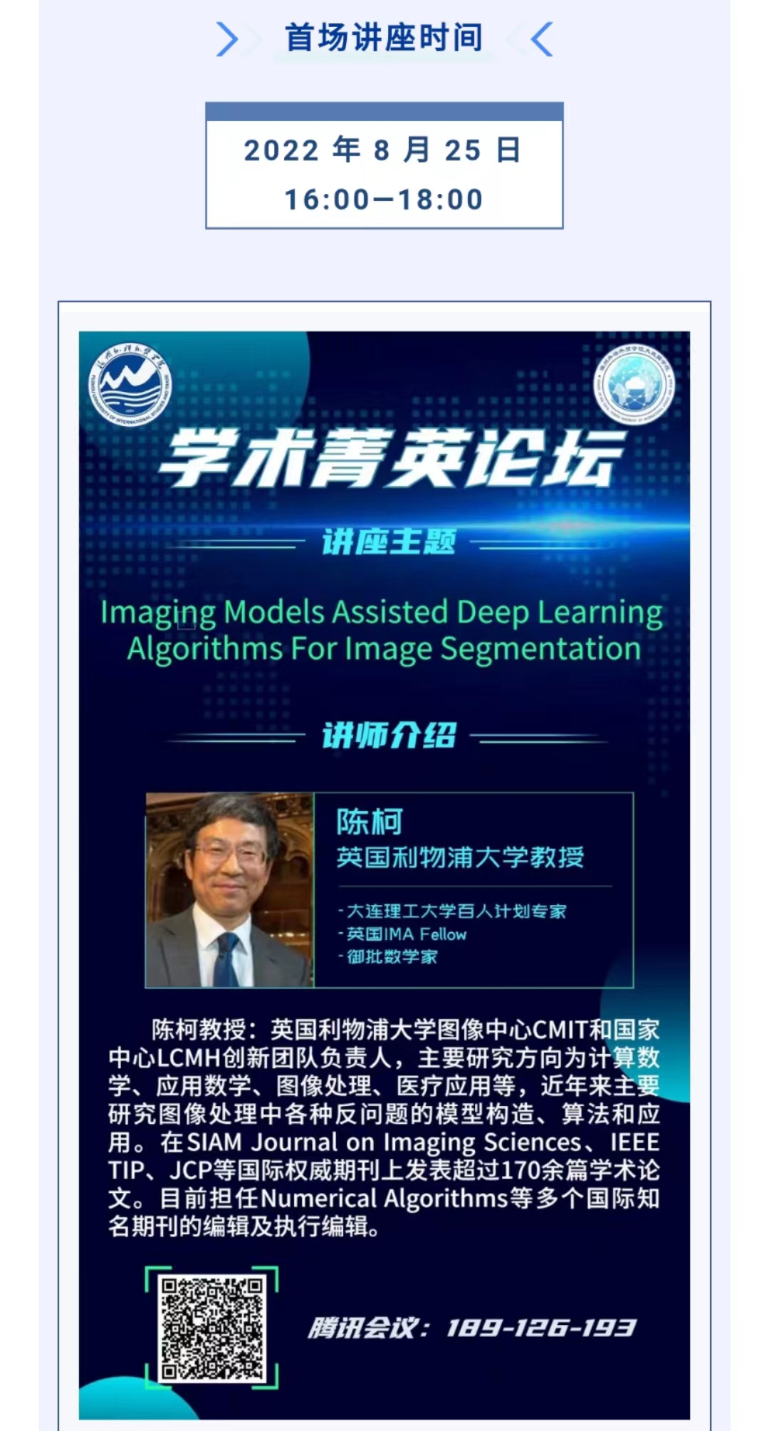 学术菁英论坛第二期第一场预告 大数据学院将于8月25日(周四)起陆续推出“学术菁英论坛”第二期系列讲座。本期拟邀请英国利物浦大学陈柯教授、华南师范大学黎稳教授、厦门大学白正简教授、大连理工大学于波教授、兰州大学郑兵教授、江苏师范大学庞宏奎教授六位重量级专家学者担任主讲嘉宾,主题涵盖Imaging Models Assisted Deep Learning Algorithms For Image Segmentation、基于张量SVD分解的张量RPCA非凸低秩正则化模型、A Column-Wise Update Algorithm for Sparse Stochastic Matrix Factorization、All-at-once method for variable-order time fractional diffusion equations等。 大数据学院办公室 2022年8月15日