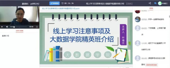 叶福兰教授还对线上学习注意事项如:课表查询方法、上课平台、课程通知群等问题进行解答。详细介绍大数据学院国际化视野精英班的优势特色、考核机制、选拔条件等,鼓励新生们踊跃报名。