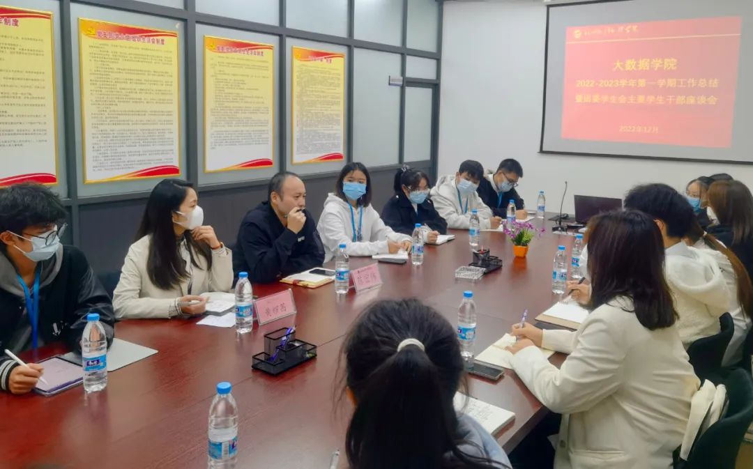 大数据学院召开学生干部座谈会 为进一步做好我院团委学生会工作,大数据学院12月7日召开2022-2023学年第一学期团委学生会主要学生干部座谈会。会议由团委副书记黄椤茜老师主持。 团学主要干部就本学期的工作进行汇报并围绕参与团学工作的收获和对未来的规划等问题各抒己见,发表看法 座谈会期间,陈宏伟书记认真听取了大家的工作思路,向过去一学期辛勤付出的学生干部表示衷心的感谢。他提到,学生干部首先要提升自身能力,并改善工作方法,着力于打造契合各部门“品牌活动”。 紧接着陈宏伟书记提出五点要求: 青春——学生干部应当充分发挥青春力量,积极主动地带领同学参与到学院各项工作之中; 实干——学生干部应当要有踏实做事的本领,在实践工作中注重细节,提高工作效率,提升工作质量; 有为——学生干部应当朝担当有为的目标努力奋进,把工作做好、做实、做大,争取实现工作效益最大化; 担当——学生干部应当树立干部意识,自觉履行干部义务,找准自身定位,明确责任意识和使命意识。 奉献——学生干部应当要具有奉献精神,怀有服务意识,对学院工作要有强烈的集体荣誉感。 “青年强,则国家强。当代中国青年生逢其时,施展才干的舞台无比广阔,实现梦想的前景无比光明。”通过此次会议,全体学生干部进一步明确了工作目标,理清了工作思路,激发了工作热情,增强了工作的责任心和使命感,提高了为学生服务的意识,也为我院日后开展各项管理工作奠定了坚实的基础。 大数据学院办公室 2022年12月7日