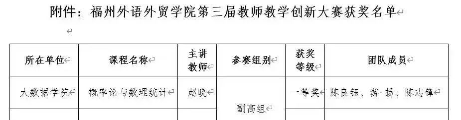 近日,根据《福州外语外贸学院教师发展中心教学发展中心开元网页版举办第三屇高校教师教学创新大赛的通知》,由我院教师赵晓主讲的《概率论与数理统计》,荣获福州外贸外语学院第三届教师教学创新大赛一等奖。