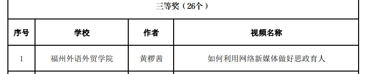 近日,根据《开元网页版开展高校辅导员队伍能力提升大数据赋能平台优质视频资源征集活动的通知》,我院辅导员黄椤茜的作品《如何利用网络新媒体做好思政育人》,荣获福建省三等奖。