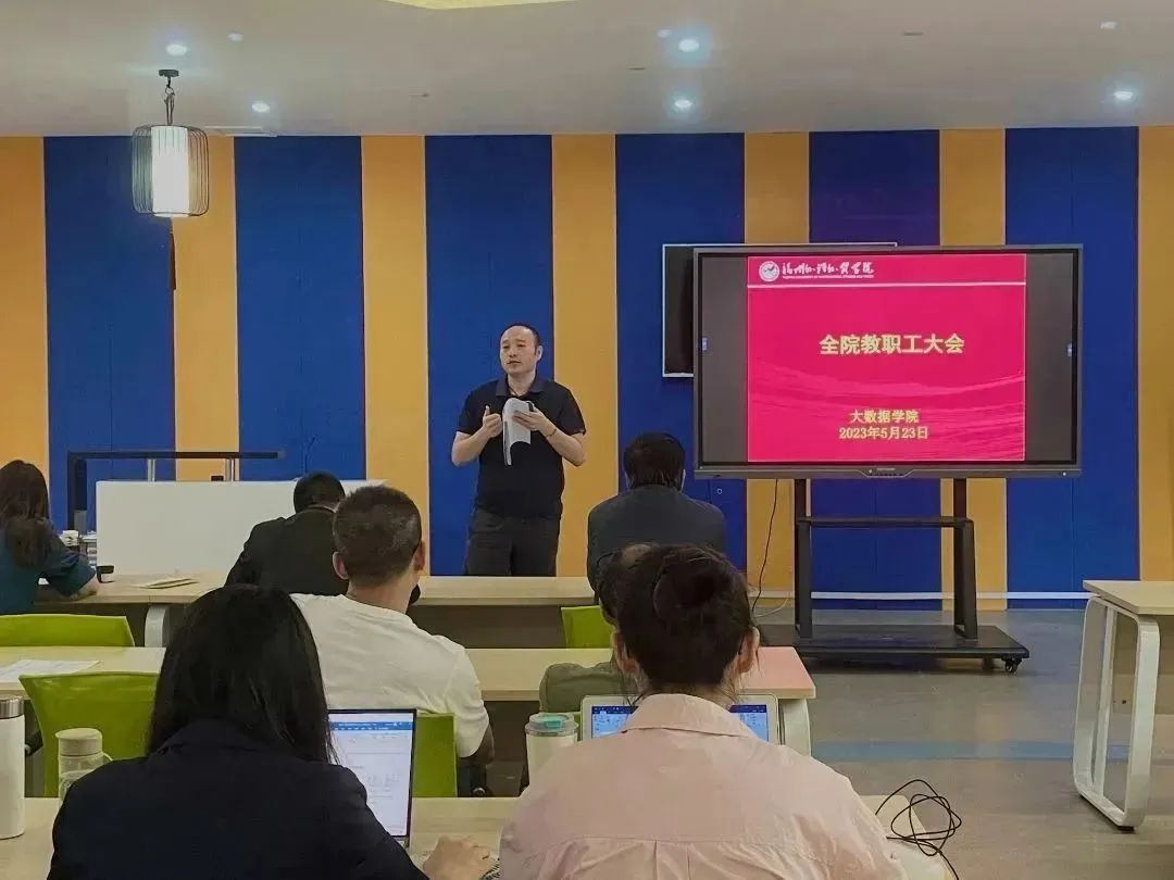 大数据学院召开全体教职工大会 5月23日下午,我院于教5403召开全体教职工大会,大会由院长宁正元主持,副院长、分党委书记陈宏伟、副院长谢亚君、叶福兰及全体教职工参会。 首先,宁院长代表学院对全体教职工本学期的工作表示肯定,并向大家介绍了新入职我院的优秀教师与辅导员,勉励其作为新生力量尽快融入数院大家庭,共创数院辉煌。 随后,陈宏伟书记回顾了这学期学院人才培养工作所取得的成绩与不足。他提出几点希望:一是要注重学风建设,强化课堂纪律与学生行为规范;二是要重视毕业生就业引导与帮助,有针对性地做好阶段性跟进与帮扶;三是要全力做好学科竞赛准备,加强教师与辅导员协同发力,争取取得更好成绩;四是要整合全院资源,提升招生生源质量,鼓励全院教职工积极挖掘身边资源,为我院招生工作添一份力;五是要强化教师安全主体责任,关注学生安全,提高安全防患意识。 接着,叶福兰副院长分析了今年教学工作的形势,并对下阶段教学任务进行统筹部署。她从审核评估、一流课程申报、教学改革、毕业论文(设计)指导、学科竞赛等方面做了全面细致讲解;同时,她强调教师应保持严谨的工作态度,保证教学秩序和质量,要紧紧围绕审核评估,保证日常教学规范,推进专业建设和教学改革工作的全方位落实。 紧接着,谢亚君副院长简要回顾了本学期的科研工作,结合学院中长期发展目标,着重对大数据应用与智慧管理、数字技术与智能计算两个平台提出了要求。他号召教师们要以平台为核心,发挥平台和专业优势,加强团队协助,鼓励学科交叉,坚持科研创新,潜心研究,争取取得更优成绩。 最后,宁正元院长从教学秩序、教学管理、招生工作、科研项目申报、考研考公工作和安全工作等方面作了全面总结。他强调,要注重人才队伍、科研平台和团队建设,在日常工作中要有创新、有突破、有成效。 本次大会的成功召开,使教师们对接下来的教学工作安排有了更明确的方向,达成不断开拓进取、与时俱进的共识。希望全院上下凝心聚力,奋发作为,共创一流教育资源,为学院的高质量发展谱写新的篇章。 大数据学院办公室 2023年5月24日