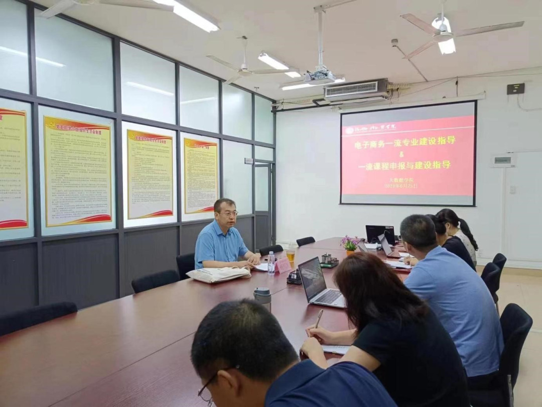6月25日上午,电子商务教指委专家杨兴凯教授来院指导一流专业建设和一流课程的申报与建设,双方就学院一流专业建设、专业申报等多方面进行深入交流。大数据学院各系主任及优秀教师代表等8人出席了此次指导会。会上,杨兴凯教授对我院电子商务一流专业建设提出了宝贵的建设性意见,并就一流课程申报指出要想加强对学科的建设,必须从学科定位、科学研究、教学工作与人才培养、学科基地或工作条件建设、学科的管理等多方面入手。