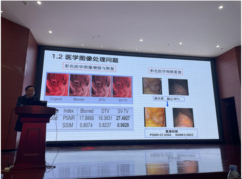 贾志刚教授围绕图像处理领域的热点问题,介绍了几种最新的基于四元数表示的彩色图像恢复模型,包括QMC模型、NSS-QMC模型、SV-TV模型等,并对彩色图像低秩逼近的理论进行了全面分析。讲座结束后,与会师生就报告内容踊跃提问,贾志刚教授一一详细解答,在场师生受益良多。
