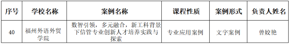 近日,福建省新工科教育联盟公布了福建省第二批新工科教育优秀教学案例入选名单。信息管理与信息系统系主任曾姣艳老师所申报的“数智引领,多元融合,新工科背景下信管专业创新人才培养实践与探索”案例成功入选。