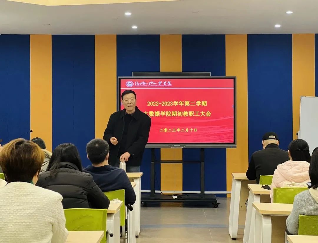 大数据学院召开2023年春季开学全体教职工大会 2月10日上午,我院召开2022-2023学年第二学期期初教职工大会,院长宁正元主持会议,学院党政领导班子及全体教职工参加了会议。首先,宁院长代表学院向克服疫情困扰、辛勤奋斗取得5A卓越绩效的全体教职工致以新春问候与诚挚祝福!并向大家介绍了新入职我院的优秀青年教师,勉励其作为新生力量尽快融入数院大家庭共创辉煌。 随后,陈宏伟书记回顾了2022年学院人才培养工作所取得的成绩与不足;强调今年是贯彻落实二十大精神的开局之年,同时也进入疫情后时代,要鼓足干劲、积极转变工作方式方法,贴近教科研一线,加强面对面交流、合力攻关;并对开学初学生返校、考研、创新创业、就业等重点工作做了精细部署。 接着,叶福兰副院长对去年学院上下齐心协力,在教学工作中取得的A+成效深表欣喜,并与大家一起分析了今年教学工作的形势,提出在产业学院、课程思政、校企合作等方面后期加力的方向;同时结合新学期开学在即,就开学第一堂课及学期教学工作的方方面面进行了详细的布置。紧接着,谢亚君副院长就学院全体教师在2022年科研工作取得全校最高超分比例所付出的艰辛予以充分肯定,并与大家一道分享了今年在创新平台、创新团队、高质量项目论文等方面任务的工作思路,希望教师间以老带新,多交流研讨,聚焦命题共同攻关。最后,宁正元院长感谢各分管领导和全体教职工的辛勤努力,并对在寒假期间为省级项目和平台申报、国自科和国社科项目申报忙碌的教职工深表谢意。指出新的一年要围绕学科建设和“数字服务工匠”应用型人才培养的目标,在教学科研、社会服务、人才培养、队伍建设等方面拿出新举措取得新成绩。要求学院党政要为教职工做实事,切实从“管理”转化为“服务”,助推学院建设更上一层楼! 大数据学院办公室 2023年2月11日