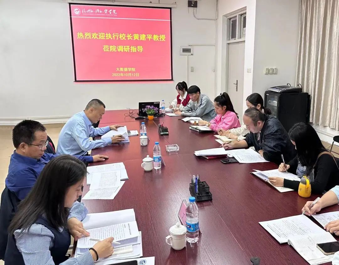 我校执行校长黄建平一行莅临我院调研 10月12日,执行校长黄建平教授,学生发展中心主任刘若福副教授及学生发展中心有关人员莅临我院调研学生工作。学院副院长、分党委书记陈宏伟副教授代表学院对黄建平校长一行的到来表示欢迎,学院办公室副主任及全体辅导员一同参与此次调研。 会上,陈宏伟书记就学院学生及辅导员队伍情况、学生工作开展情况及下一阶段建设目标与举措、学院一院一品工作进行详细汇报,随后学院辅导员就所带学生情况、一岗双责、工作成效等逐一汇报。 黄建平校长认真听取汇报并对学院的工作给予了充分肯定,结合学校高质量发展目标及工科类学生特征,为学院发展提供了科学的指导意见。要重视自我提升。善于研究问题,发挥个人专长,把日常工作与科研相结合。提高人才培育质量。坚持问题导向、结果导向,挖掘学生特点,科学目标,细化措施,争取就业、考研、创新创业等重点工作再突破。注重品牌建设。加强学院一院一品项目的宣传与影响力,发挥榜样引领,开展师生喜闻乐见的活动,培育文体活动品牌,提升学院活力。 大数据学院办公室 2022年10月12日