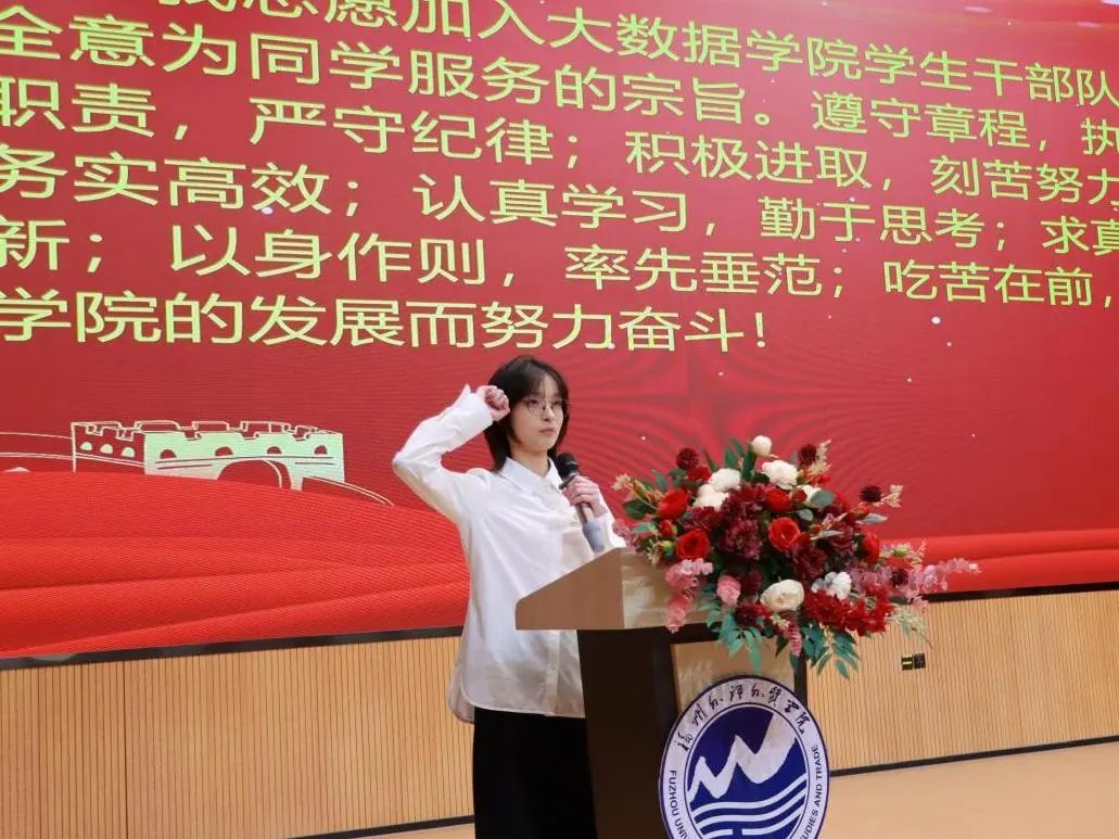 【数院动态】大数据学院召开滨海校区2024级学生干部任命仪式 12月12日,大数据学院2024级学生干部任命仪式在滨海校区学术报告厅隆重召开。学院副院长、分党委书记汪翠茹,办公室副主任、团委书记黄荣华,2024级各新生辅导员以及滨海校区2024级学生干部代表参加了本次任命仪式。大会由团委常务副书记黄椤茜主持。 01.奏唱国歌 全体起立,齐声奏唱国歌。 2.宣读任命决定 黄荣华老师宣读《共青团福州外语外贸学院大数据学院委员会开元网页版滨海校区2024级团总支学生干部任命的决定》、《大数据学院开元网页版滨海校区2024级班委任命的决定》、《大数据学院开元网页版滨海校区2024级楼长、层长及宿舍舍长任命的决定》等相关决定。 03.颁发聘书 为滨海校区2024级楼长、层长及宿舍舍长代表颁发聘书。 为滨海校区2024级班委代表颁发聘书。 为滨海校区2024年级团总支学生干部颁发聘书。 04.新任干部宣誓仪式 滨海校区学生干部代表沈思睿同学领誓,全体学生干部起立共同宣读誓词。 05.学生干部代表发言 学生干部代表林晚甜同学上台发言,她对学院的重视与培养表示衷心的感谢,号召全体学生干部以坚定的信念、扎实的工作为学院的发展贡献自己的力量,携手前行共创辉煌! 06.汪翠茹书记讲话 汪翠茹书记向新加入学生干部队伍的同学们表示热烈的欢迎和祝贺!随后她提出了以下四点要求: 一是明确使命,树立正确的理想信念。要传承红色基因,坚定理想信念,以身作则,不断引领同学们向上向好。二是树立服务意识,密切联系广大同学。要树立服务意识,广泛收集同学们的意见与建议,发挥广大同学与学院沟通的桥梁和纽带作用。三是增强责任担当,发挥示范引领作用。面对困难时,要挺身而出,带领同学们克服难题。不畏艰险,勇于创新,成为同学们的品德、学习、生活等方面的榜样,她还特别指出学生干部要作为优良学风、作风的践行者和推动者,自觉为学校审核评估工作挺膺担当,发挥积极作用。四是加强自我修养,不断提升自身综合素质。要不断提高自己的综合素质,加强理论学习,提高工作能力,沟通能力,在工作和学习中不断成长,以高度的责任感和使命感为学院的发展、为同学们的成长贡献力量! 07.共唱校歌《福外赋》 全体师生起立,齐唱校歌《福外赋》 风浩荡满目新,扬帆奋进正当时!祝愿所有新任学生干部在各自岗位上发光发热,在未来的道路上勇往直前,取得更大的进步。 大数据学院办公室 2024年12月18日