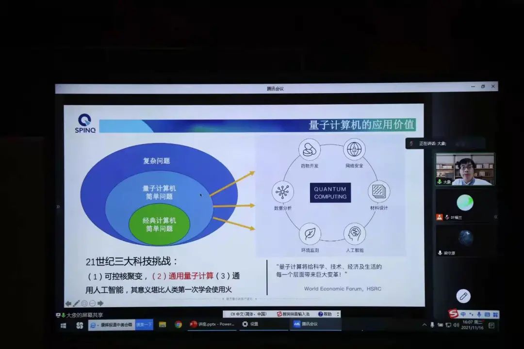 【“数”业有专攻】大数据学院开展“NISQ时代的量子计算”学术讲座 为提高我院师生对量子计算的了解,增强学术氛围。11月16日下午4点,我院于5403教室召开“NISQ时代的量子计算”线上专题讲座,本次讲座由我院副院长叶福兰教授主持,项金根博士主讲。 项金根 项金根,物理学博士,计算机硕士 深圳量旋科技有限公司创始人,董事长,中国计算机学会量子计算专业组常务委员。毕业于清华大学物理系和滑铁卢大学计算机系,分别于1999年和2005年获得物理学学士学位和博士学位,于2013年获得计算机硕士学位。2005年至2011年,在哈佛大学从事博士后和副研究员工作,发表Sci论文10多篇,引用数量超过600次。此后在多家公司担任软件和算法部门的负责人。2018年,创办深圳量旋科技(SpinQ)有限公司,致力于量子计算机的商业化和普及化。量旋科技核心团队成员来自哈佛大学、麻省理工学院、剑桥大学、清华大学、北京大学、中国科技大学、香港科技大学等海内外顶级学府,团队成员发表量子计算相关论文超过200篇。2020年,带领团队研发并发布了全球首款桌面型量子计算机,现已销往加拿大、挪威、澳大利亚等多个国家和地区,受到国际知名杂志Discovery的关注。量旋科技和其他科研院所及公司研发部门展开合作,在量子神经网络、量子化学计算和量子金融等领域发表多篇学术论文。量旋科技是深圳市计算机学会副理事长单位,入围2020世界计算机大会创新技术和产品应用成果展示,获得招商银行“新动能基金” 重点推荐投资企业、2020年度ICT企业家大会 ICT产业创新企业奖、产业创新产品奖等荣誉称号。 首先,项金根博士通过经典计算机和量子计算机的类比展开详细阐述。项金根博士介绍了第1、2次量子革命,同时用图表分析计算力需求引出本次讲座的主题:量子计算。他举例分析量子计算机的应用价值和量子计算机加速原理,并且得出了量子纠错的解决方式,再通过多种算法的优势总结说明量子计算的价值。 最后,项金根博士从量子计算教室和量子编程的举例中引发了师生们对量子计算未来的遐想。在全场热烈的掌声中,讲座圆满结束。 大数据学院办公室 2021年11月16日