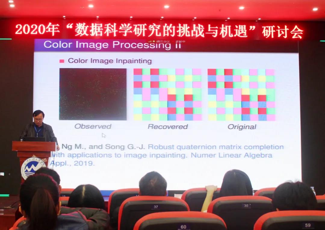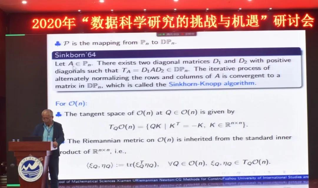 数据未来,未来已来|国内权威数据学者福外论道 11月21日-22日,2020年“数据科学研究的挑战与机遇”研讨会在福州外语外贸学院隆重召开。 本次研讨会以“数据科学研究的挑战与机遇”为主题,特邀多位知名学者和行业专家汇聚福外,共同深入探讨目前数据科学研究领域中的挑战性问题和未来新的研究方向。 ♦开幕式上,谢亚君教授介绍了特邀嘉宾与在场人员。 ♦副校长姜建设教授致辞并祝贺。 ♦之后姜建设教授为客座教授张怀进行聘书颁发。 随后,包括国家杰出青年科学基金获得者在内的12位双一流高校知名专家做相关学术报告。 中国科学院大学——张怀教授 “数据科学与计算地球动力学的挑战” 张怀以“数据科学与计算地球动力学的挑战”为题,首先提出了计算地球动力学的战略地位,可将其用来解决地球板块运动问题。他对当今所面对的诸多挑战提出了相应的措施,详细讲解了开元网页版大数据和先进算法相结合的双驱动模型,给出了模型与数据双驱动建设的当前以及未来研究范式。最后以未来十年量子计算和量子信息的发展潜力为结尾,提出总结与展望。 北京大数据研究院——欧高炎研究员 “大数据及其在金融风控中的应用” 欧高炎以“大数据及其在金融风控中的应用”为题,从大数据分析的历史起源入手,通过美国信用体系来展开数据采集、整理及建模分析。他介绍了大数据的常用模型、模型评价指标和建模方案。他将全量规模和样本规模对模型的影响进行对比,通过五种算法指标重要度的综合排序,提出了对个人信用评估影响的因素,提供了我们未来可以的探索的方向。 复旦大学——高卫国教授 “Alternating Semidefinite Programingfor Block Bi-clustering" 高卫国以“Alternating Semidefinite Programingfor Block Bi-clustering”为题,系统、全面分享了大数据在数学方面中的应用,并提出一个凸模型和一个交替SDP算法,得到理论优于现有的界,也通过实验证明了该算法的有效性。 大连理工大学——董波教授 "Inter Matrix Approximation and Data Mining" 董波以“Integer Matrix Approximation and Data Mining大连理工大学 ”为题,围绕非负矩阵分解与整数矩阵逼近与数据挖掘展开分析,讨论了随机生成整数矩阵的数值应用,并分享了对整数矩阵近似技术的研究,通过数据分析和数据挖掘,得出比其他现有方法更精确地计算离散数据集的解,为大数据分析和大数据挖掘的应用开启了“一扇窗”。 厦门大学——白正简教授 "Riemannian Newton-CG Methods for Constructing a Positive Doubly Stochastic Matrix from Spectral Data" 东南大学——李铁香教授 "3D Conmputational Conformal Geometry with Applications" 李铁香以“3D Computational Conformal Geometry with Applications”为题,提出网格参数化的计算,在这项工作中,发展了新的能量最小化算法,分别用于计算亏格零闭曲面的保角、保球面面积和保体积参数化。随后她展示了利用特征点在动画与医学上的应用,多方位阐述了共形几何的重要作用及意义。 中国矿业大学——吴钢教授 "Randomized approximate class-specific kernel spectral regression analysis for large-scale face verification" 吴钢以“Randomized approximate class-specific kernel spectral regression analysis for large-scale face verification”为题,围绕人脸验证问题,从本质上提出了两种基于ACS-KSR方法的随机算法。通过不断优化解决问题后提出了一种随机分组Kaczmarz算法,研究了算法的收敛性。通过综合数值实验验证了理论结果的有效性和所提方法的有效性,让人脸验证技术上升了更高的台阶。 江苏师范大学——贾志刚教授 "Color Image Restoration by Saturation-ValueTotal Variation" 贾志刚以“Color Image Restoration by Saturation-ValueTotal Variation”为题探究了用于灰度图像边缘恢复的全变分正则化方法。他提出并发展了一种新的饱和度值(SV)颜色全变差正则化方法,并将研究SV全变差正则化的性质以及由此产生的彩色图像恢复优化模型加以诠释。数值算例表明,新的SV全变分方法在多种指标上优于现有的彩色图像全变分方法,为彩色图像的复原提供了技术条件和支持。 浙江大学——黄正达教授 "On a progressive and iterative approximation method with memory for least square fitting" 黄正达以“On a progressive and iterative approximation method with memory for least square fitting”为题,提出了一个渐进式和迭代式的最小二乘拟合法,通过迭代调整控制点和加权和,构造一系列三权拟合曲线。随后他采用几种实例说明,线性最小二乘法可以方便地解决动力学参数问题。这种方法避免了复杂的数学处理,有效地降低了计算误差,结果更为精确,正是最小二乘法误差分析的研究促进了线性理论模型的发展。 兰州大学——张国凤教授 “Fast algorithms for time-harmonic PDE optimalcontrol problems” 张国凤以“Fast algorithms for time-harmonic PDE optimalcontrol problems”为题,从时谐偏微分方程约束优化问题的离散化出发,研究一类结构线性系统的鲁棒预处理,并提出了鲁棒参数化预处理方法,进行了数值实验,数值结果表明,相应的预处理方法性能良好,与理论结果吻合良好。在解决这类控制问题的高效性及可靠性。 中国传媒大学——康彤 “Fully discrete T-ψ finite element method to solve a nonlinear induction heating problem” 康彤以“Fully discrete T-ψ finite element method to solve a nonlinear induction heating problem”为题,深入研究了由Maxwell方程和热方程耦合描述的感应淬火模型。接