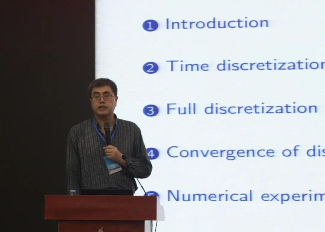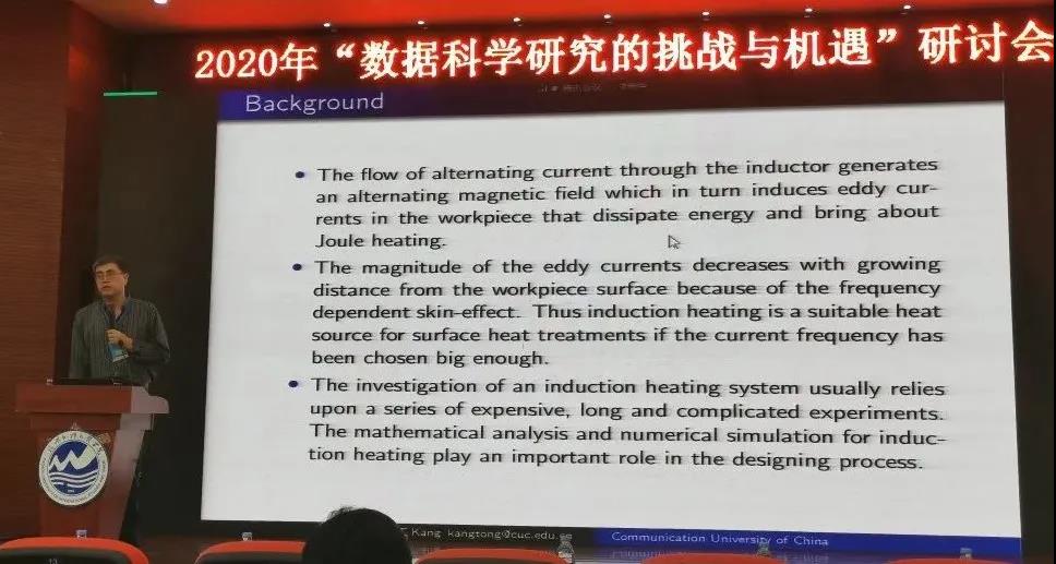 康彤以“Fully discrete T-ψ finite element method to solve a nonlinear induction heating problem”为题,深入研究了由Maxwell方程和热方程耦合描述的感应淬火模型。接着他提出了一个完全离散的T-ψ有限元格式,并讨论了其可解性。他解释到T-ѱ方法能更好地处理媒体的不连续性,在非导电领域的应用大大降低了计算成本。最后通过数值实验的结果进行总结分析。