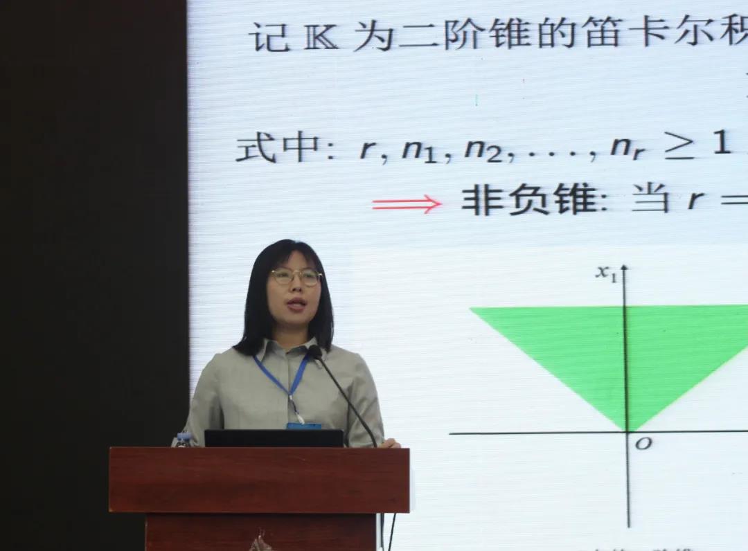 柯艺芬以“旋转锥互补问题的松弛模系数值算法”为题,她从锥互补问题的应用背景展开讲述,使用锥互补问题使用松弛模系矩阵分裂迭代算法快速地求出满意的近似解对。证明了二阶锥互补问题的理论研究为三维摩擦接触问题提供了更为完备、简洁的数学模型,相比传统计算方法,其数值算法的效率也有了很大的提高。