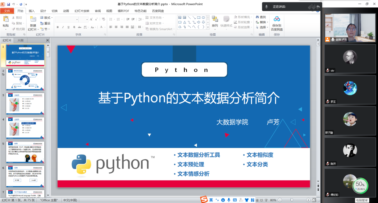 2022年10月27日上午,大数据学院卢芳老师在线上腾讯会议作“基于Python的文本数据分析简介”的专题讲座,2020级大数据管理与应用专业1班的部分同学与会听讲。