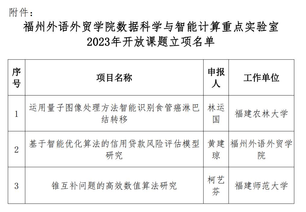 根据《福州外语外贸学院数据科学与智能计算重点实验室 2023年开放课题指南》的通知要求,经专家评审和重点实验室学 术委员会研究,确定对“运用量子图像处理方法智能识别食管癌 淋巴结转移”等3项开放课题进行立项(名单详见附件),现就有 关事项通知如下:
