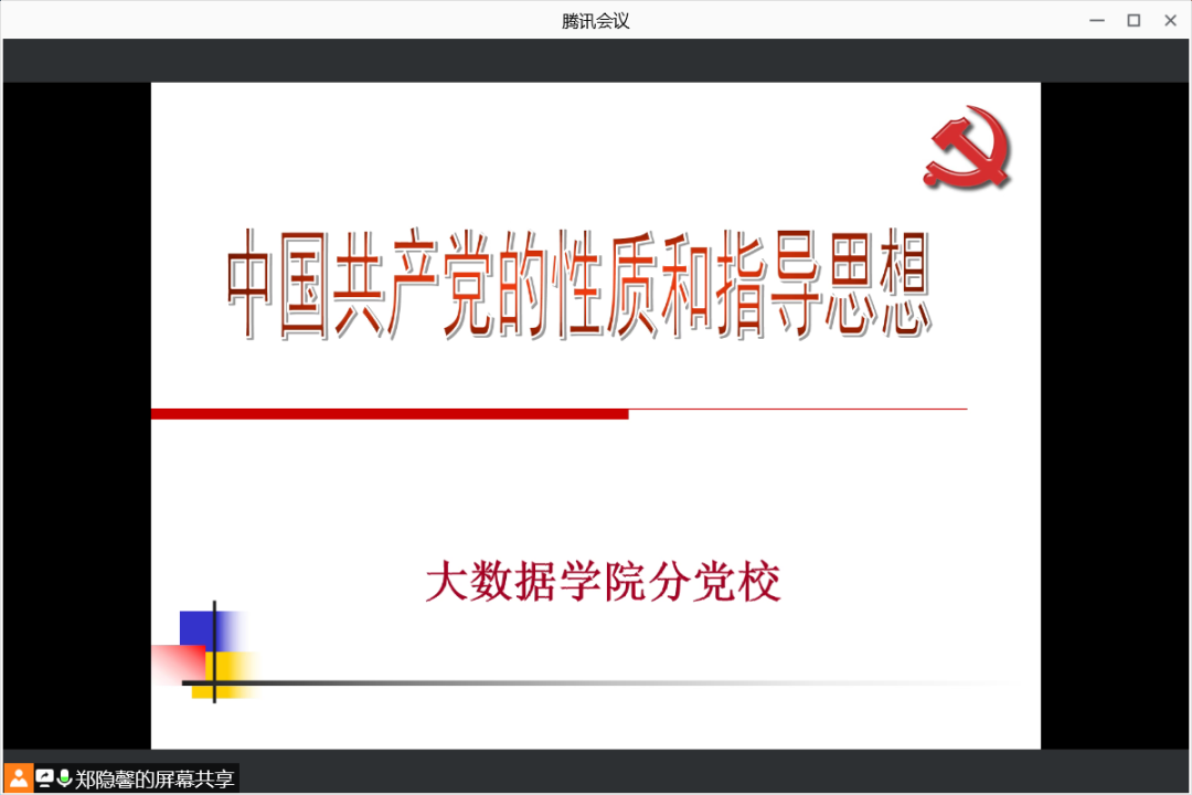 2022年1月12日下午18:30,大数据学院分党委组织全体党员在腾讯会议开展了由郑隐馨老师主持的以“党的性质和党的指导思想”为主题的党校培训,旨在引导学员们深入学习领悟习近平新时代中国特色社会主义思想,切实增强全面从严治党的自觉性和坚定性。