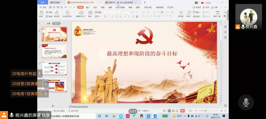 2022年1月16日下午18:30,大数据学院分党委组织全体党员在腾讯会议开展了由杨兴鑫老师主持的以“党的最高理想和现阶段的奋斗目标”为主题的党校培训,旨在引领学员们不断提高思想觉悟,赓续红色血脉,在坚守理想和实现理想的征途上奋力前行。