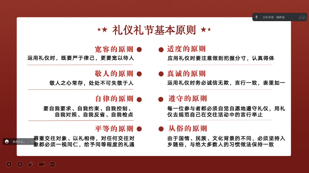 学生第二党支部书记杨兴鑫同志指出,礼仪礼节是道德素养的体现,也是社会不变的底色。党员们要以身作则,遵守传统礼仪礼节,积极传承和弘扬中华传统文化,更好地履行党员责任,促进全社会的文明素质提升,推动社会和谐发展。