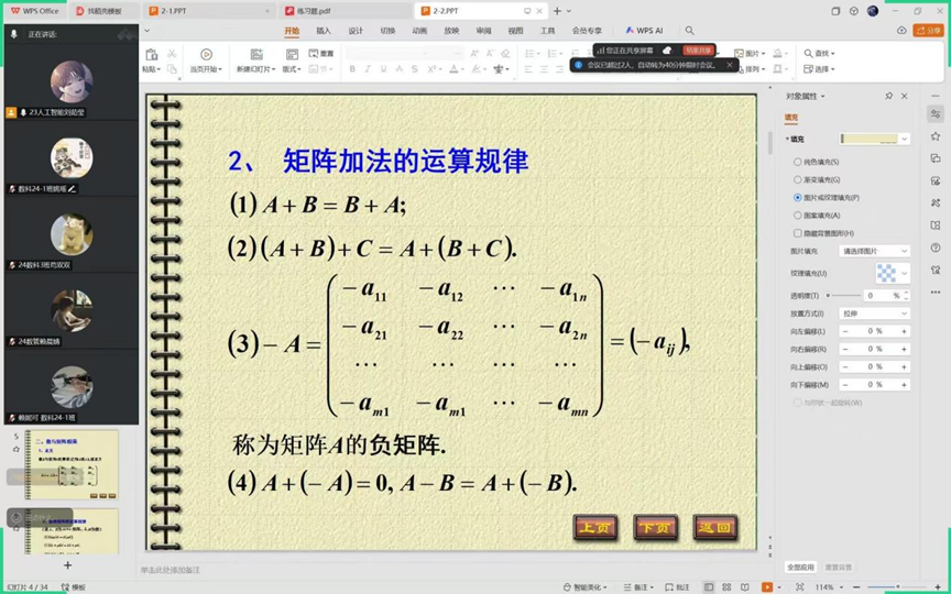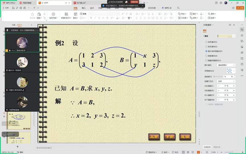 刘茹莹同学由矩阵的基本概念和定义入手,以清晰易懂的语言为同学们梳理了知识框架。在讲解过程中,她不仅系统性地介绍了矩阵的运算规律,还由浅入深地通过一些典型例题帮助同学们逐步掌握知识。