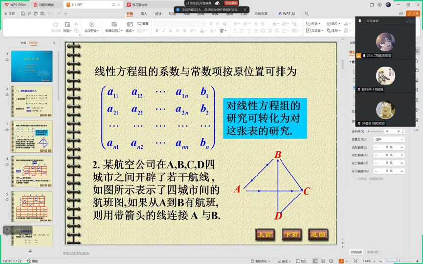 【朋辈引航 携手成长】大数据学院开展线性代数朋辈帮扶活动 为帮助2024级本科的同学们提高线性代数技能,我院于2025年3月21日利用腾讯会议开展线性代数的朋辈帮扶活动,本次活动由2023级人工智能1班的刘茹莹同学主讲。 刘茹莹同学由矩阵的基本概念和定义入手,以清晰易懂的语言为同学们梳理了知识框架。在讲解过程中,她不仅系统性地介绍了矩阵的运算规律,还由浅入深地通过一些典型例题帮助同学们逐步掌握知识。 24级数据科学与大数据技术3班张小寒:本次线性代数的辅导让我收获颇丰,小导师的讲解清晰明了,把复杂的知识点讲解的通俗易懂 。 24级大数据管理与应用3班郑奕菲:本次辅导对学习线性代数帮助太大了!之前自己看书时,很多地方理解模糊,在矩阵的计算的讲解中,不仅点出了常见的运算错误,还分析了其原因,提出了简便方法,让我避免了很多运算错误。 大数据学院办公室 2025年3月24日