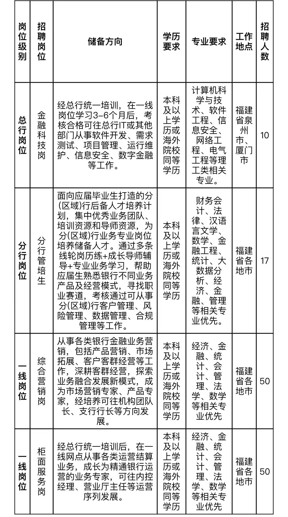【就业指南】泉州银行股份有限公司2024校园招聘简章 一、企业简介 泉州银行成立于1997年6月,总行设于福建省泉州市,目前网点136家(含58家社区银行),实现福建省各地市全覆盖,形成以泉州为中心,福州、厦门为增长极,省内其他城市为支撑 的区域化发展格局。目前已启动上市筹备工作。 长期以来,泉州银行以“特色化、专业化的区域精品银行”为愿景,坚持城商行“三服务”定位,秉承“人本、诚信、创新、奋进”的核心价值观,倾力打造运营稳健、布局完善、专 业精深的商业银行。在全国范围内首创以无还本续贷为亮点的“无间贷”品牌,创新解决实体经济、中小微企业“融资难、融资贵、续贷难”问题,在全国产生广泛效应,连续多年上 榜英国《银行家》权威披露的“全球银行1000强”榜单、福建省纳税百强,近三年连续跻身福建服务业企业百强行列,品牌影响力稳步提升。 二、招聘岗位 01基本条件 (1)毕业时间:原则上境内高校应届毕业生应于2024年1月1日至2024年7月31日期间毕业,报到时应取得毕业证和学位证;境外院校应届毕业生应当在2023年8月1日至2024年7月31日期 间毕业,并在报到时提供国家教育部出具的学历(学位)认证。 (2)具备良好的心理素质及身体素质,具有较强的学习能力、沟通能力、团队意识和责任意识,具备良好的道德素养,无违规违纪违法等不良记录。 (3)符合监管要求亲属回避的有关规定。 (4)具体报名条件参照各岗位相关要求。 02岗位条件 03政策支持 根据党中央、国务院开元网页版实施乡村振兴战略决策部署,以及人民银行、银保监会金融支持乡村振兴的相关政策,对满足以下任一条件的优秀贫困高校毕业生,同等条件下优先录用: ①持有户籍所在地民政局出具的城乡低保家庭证明; ②持有所在高校出具的已纳入贫困生库证明; ③获得国家励志奖学金或助学金; ④获得国家助学贷款。 04普惠金融客户经理(定向) (1)岗位职责 招录人员岗位定向为普惠金融客户经理,主要职责为:负责泉州银行普惠金融业务市场营销与拓展,对小微企业、个体工商户、一般自然人进行信贷调查、分析、评估与风控,开展普惠 金融信贷投放工作。 (2)岗位条件 ①统招本科(含)以上学历,条件优秀者可放宽至大专,2023届及2024届应届毕业生。 ②专业不限。 ③具备良好的心理素质及身体素质,具备较强的服务意识、团队意识、亲和力和沟通交流能力。 ④工作认真负责,具备较强的责任心、学习能力、拓展能力。 ⑤具备良好的道德素养,无违规违纪违法等不良记录。 (3)聘用形式 采用定向岗位、定向地点方式,岗位定向为普惠金融客户经理 三、报名方式及招聘流程 (一)报名方式 PC端:登录我行招聘门户 (http://boqzhaopin.zhiye.com/campus) 选择相应岗位进行报名。 移动端: ①关注“泉州银行人力资源在线”微信公众号→点击菜单栏“泉微招聘”→“2024校园招聘”完成在线投递。 ②扫描下方二维码快速投递简历 (二)招聘流程 网申→在线笔试→心理测评→多轮面试→体检→录用 (三)联系方式 官方网址:www.qzccbank.com 地址:泉州市丰泽区泉泰路266号 如有疑问可联系:周女士 联系电话:0595-22508226 邮箱:boq_zhaopin@163.com 四、其他说明 1. 应聘者应对申请资料和个人信息的真实性负责,并应如实注明个人奖惩记录,如有隐瞒或伪造,我行有权取消其录用资格。 2. 每位应聘者仅可报考一个岗位,请慎重选择。 3. 我行将通过招聘系统信息提示、手机短信及电子邮件等方式与应聘者联系,请确保您简历上的联系方式正确无误且保持通讯畅通。 4. 我行招聘不收取任何费用。 5. 如有其他问题欢迎扫描下方二维码关注官方微信平台“泉州银行人力资源在线”(微信号 boq_zhaopin)进行互动交流。 大数据学院办公室 2023年11月21日