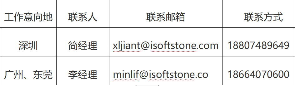 【就业指南】深圳软通动力信息技术(集团)股份有限公司 一.公司简介 中国领先的软件与信息技术服务商,致力于成为具有全球影响力的数字技术服务领导企业,企业数字化转型可信赖合作伙伴。2005年,公司成立于北京,坚持扎根中国,服务全球市场。目前,在全球40余个城市设有近百个分支机构和超过20个全球交付中心,员工85000余人。秉承用数字技术提升客户价值的使命,软通动力长期提供软件与数字技术服务和数字化运营服务,其中软件与数字技术服务包括咨询与解决方案、数字技术服务和通用技术服务;凭借深厚的行业积累,公司在10余个重要行业服务超过软1000家国内外客户,其中超过200家客户为世界500强或中国500强企业。 二.公司地址 广东省深圳市深圳市罗湖区中设广场A座 三.招聘岗位 1、硬件研发 50人(转正薪资10K~11K,无实习期,面试通过后签三方协议,毕业之后来上班) 2、影像C++ 20人(转正薪资8K~10K,有实习期,工作地东莞) 3、芯片C++ 20人(转正薪资8K~9K,接触核心科技,工作地东莞) 4、Web前端开发工程师 20人(转正薪资7K~9K,工作地深圳、东莞) 5、Python工程师 10人(转正薪资7K~9K,工作地深圳、东莞) 6、GO开发工程师 10人(转正薪资8K~10K,包三餐,工作地深圳) 7、JAVA研发工程师 30人(转正薪资6.5K~9K,工作地深圳、东莞) 8、软件测试工程师 20人(转正薪资6.5K~8.5K,工作地深圳、东莞) 9、数据库工程师 10人(转正薪资6.5K~8K,工作地深圳) 10、游戏测试工程师(转正薪资6.5~10K,工作地广州) 11、硬件测试工程师(转正薪资6.5~7K,工作地东莞) 四.各岗位的任职资格 1、计算机/软件工程/通讯/电子及相关理工科专业,本科或以上学历优先 2、基础扎实,有较强的逻辑思维能力和动手能力 3、有责任心、有耐心,具备优秀的学习能力、分析能力及卓越的团队合作能力 四.录用 面试考核合格后,公司与应届生签订三方就业协议正式毕业后,公司与应届生签订劳动合同,并缴纳五险一金 五.工作地点 深圳、东莞、广州等 六.招聘流程 发送简历—网申—线上笔试、性格测评—面试—签约1、发送简历:将您的简历发送到如下邮箱。对于满足岗位需求的学生,相关人会与您联系或安排面试。 说明:邮件主题和简历名称请务必按此格式:2022届校园招聘—学校名—个人姓名—工作意向地—意向岗位 举例:2022届校园招聘—电子科技大学—李杨—深圳—C++开发 2、网申扫码:网申后即可进行在线笔试和性格测评。 公司网址:http://www.isoftstone.com/ 所在地址:广东省深圳市深圳市罗湖区中设广场A座 大数据学院办公室 2023年12月20日