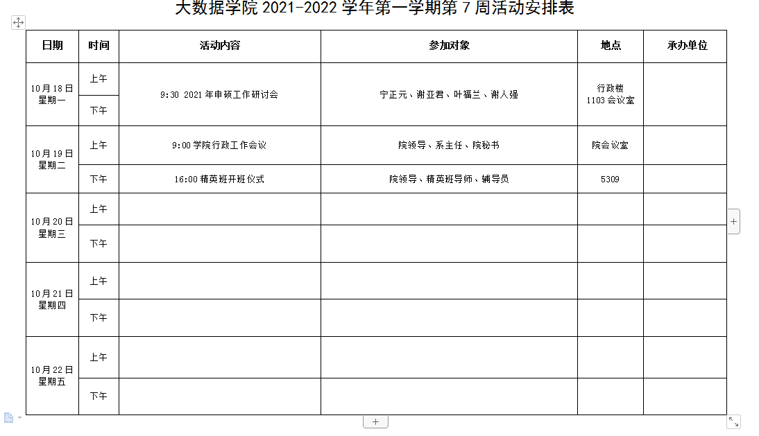 大数据学院2021-2022学年第一学期第7周活动安排表