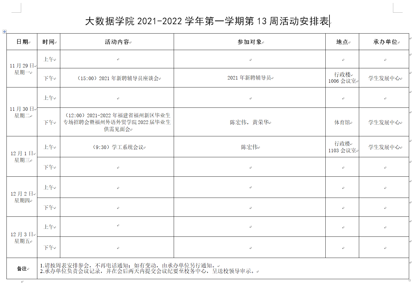 大数据学院2021-2022学年第一学期第13周活动安排表