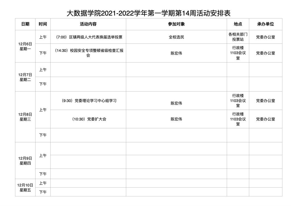 大数据学院2021-2022学年第一学期第14周活动安排表