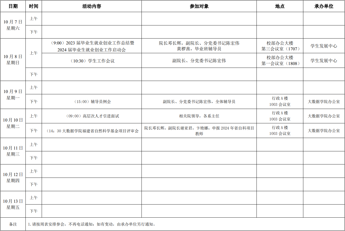 大数据学院2023-2024学年第一学期第6周活动安排表