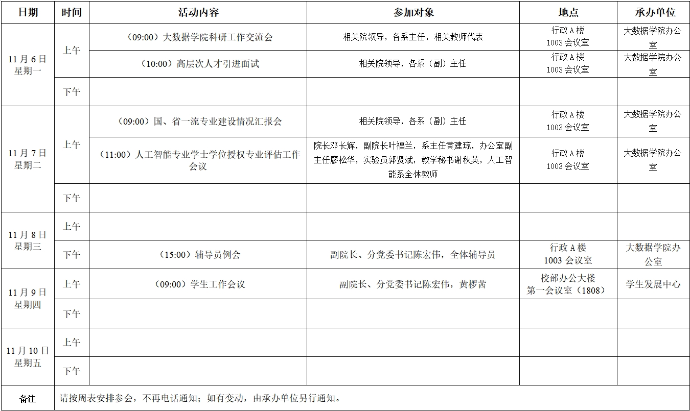 大数据学院2023-2024学年第一学期第10周活动安排表