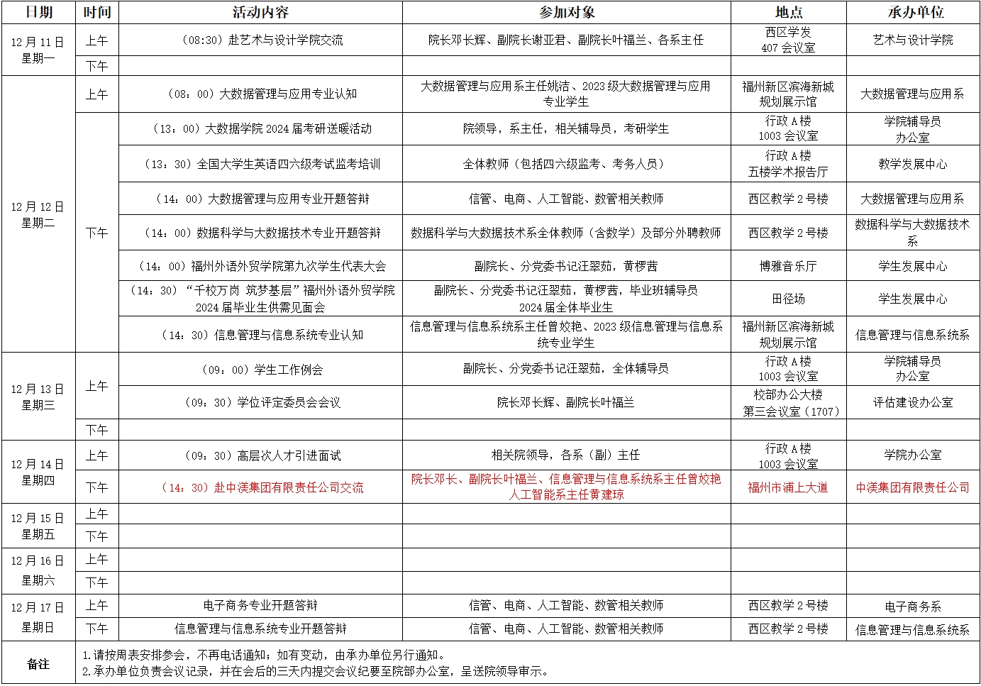 大数据学院2023-2024学年第一学期第15周活动安排表