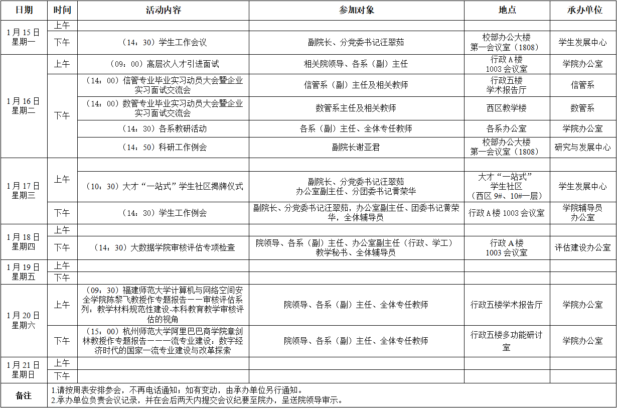 大数据学院2023-2024学年第一学期第20周活动安排表