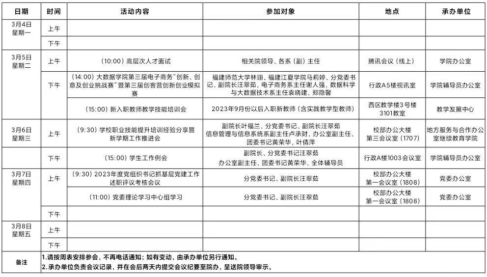 大数据学院2023-2024学年第二学期第2周活动安排表