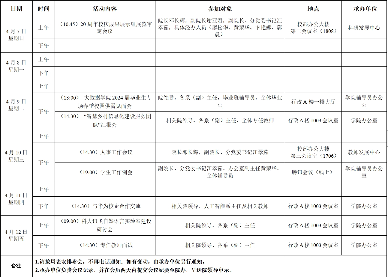 大数据学院2023-2024学年第二学期第7周活动安排表