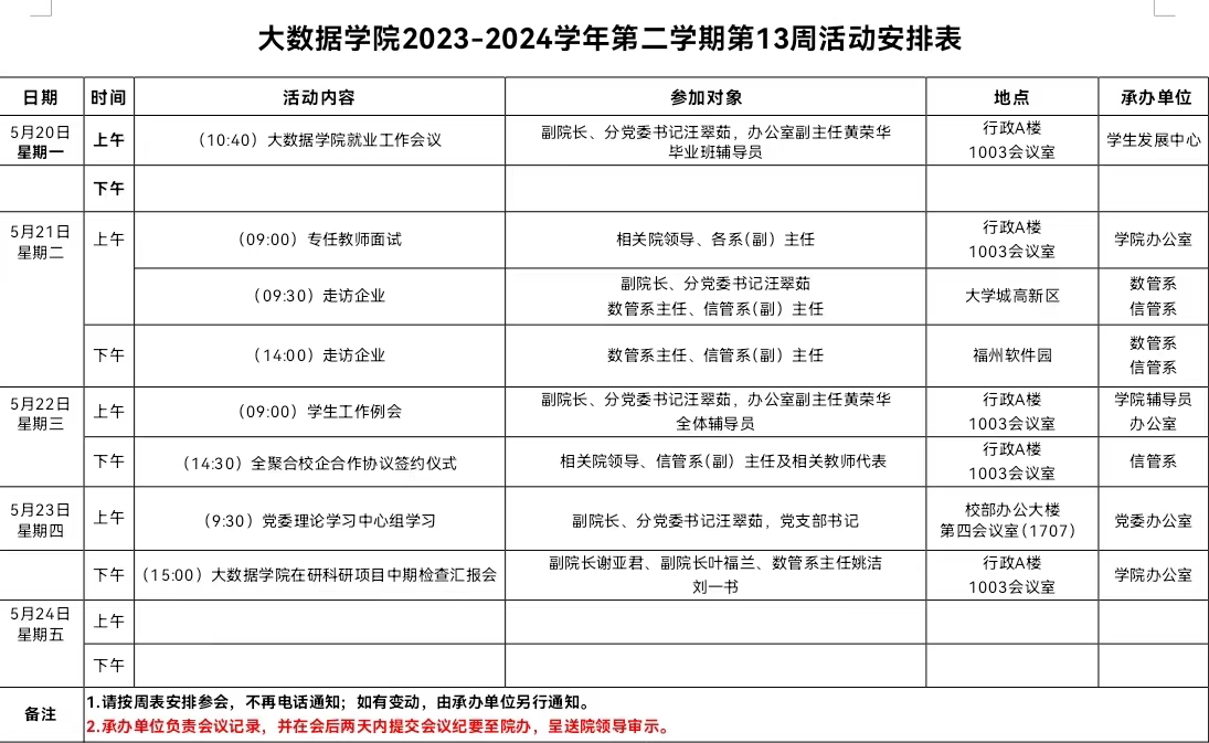 大数据学院2023-2024学年第二学期第13周活动安排表