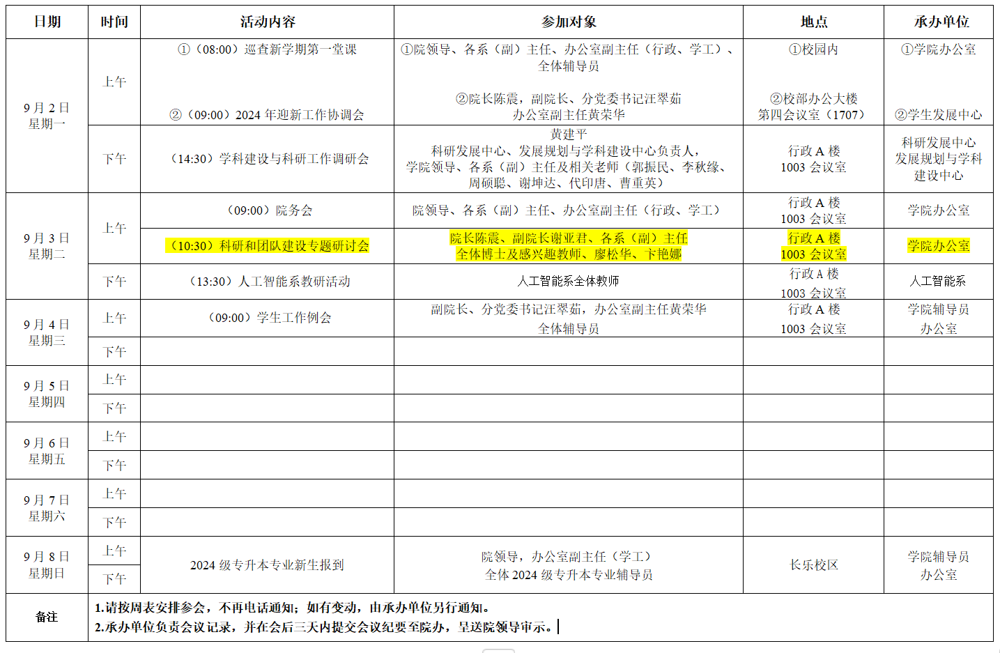 大数据学院2024-2025学年第一学期第1周活动安排表
