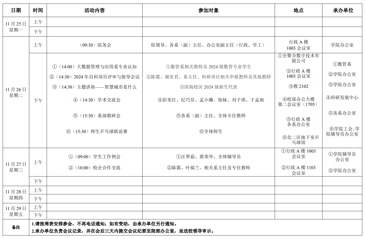 大数据学院 2024-2025 学年第一学期第 13 周活动安排表