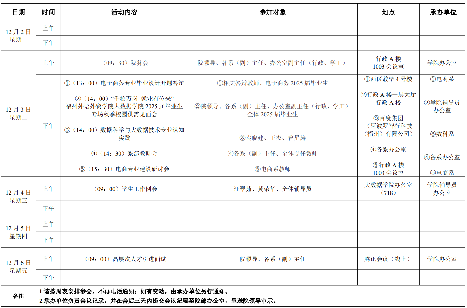 大数据学院 2024-2025 学年第一学期第 14 周活动安排表