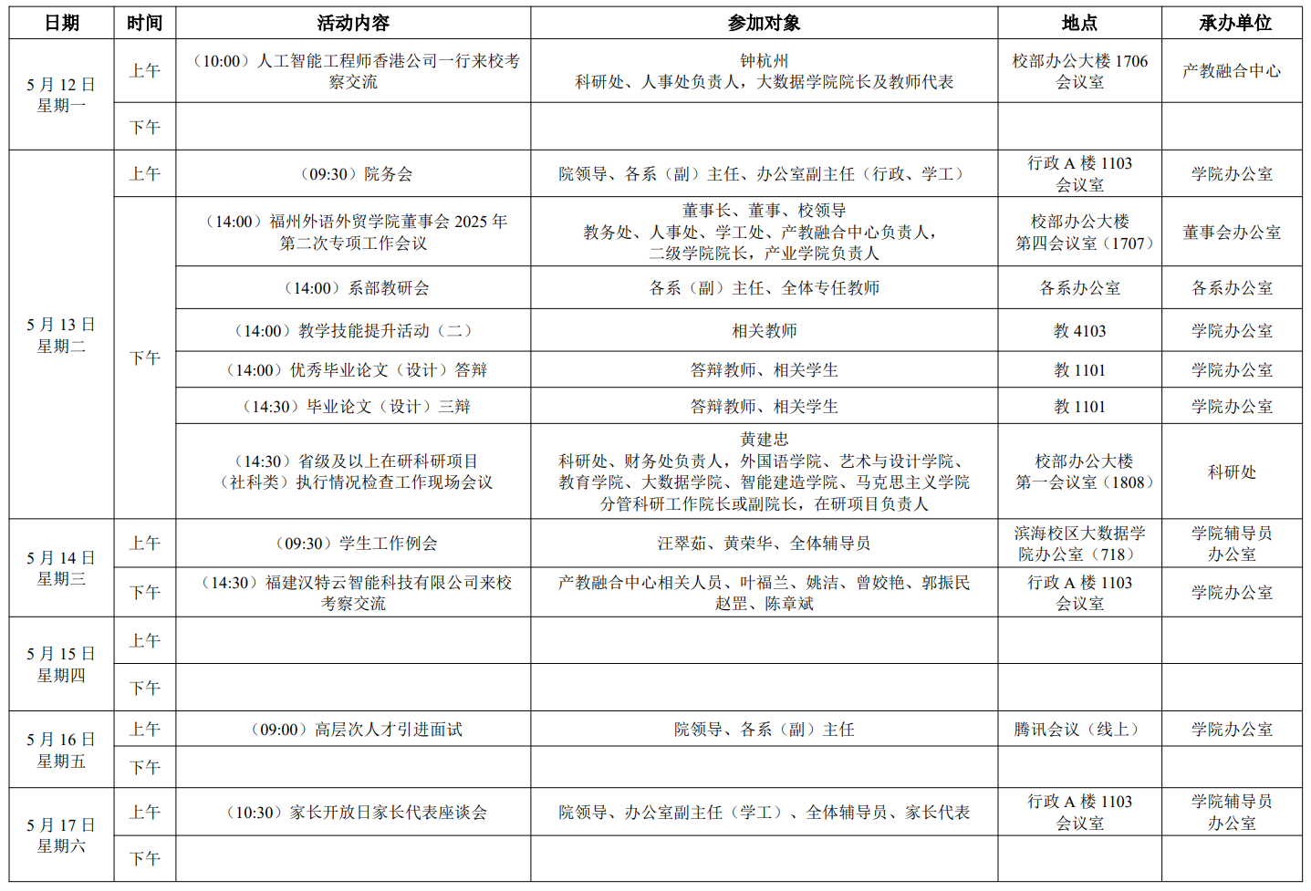 大数据学院 2024-2025 学年第二学期第 13 周活动安排表