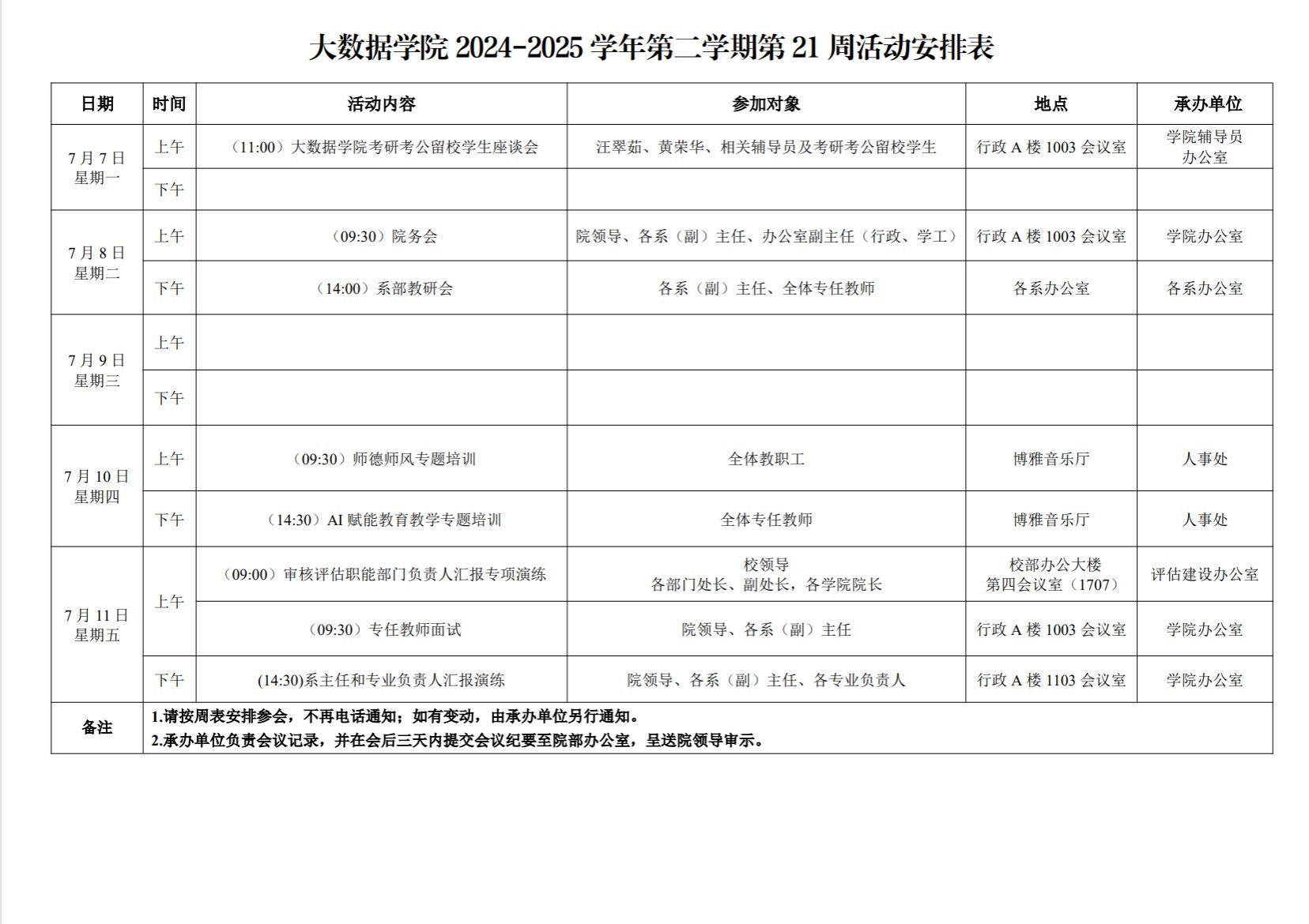 大数据学院2024-2025学年第二学期第21周活动安排表
