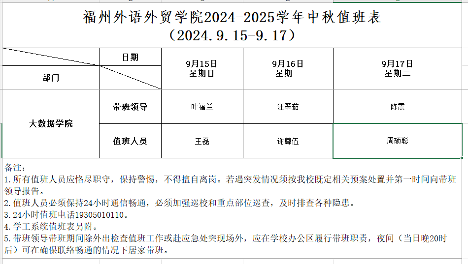 福州外语外贸学院 2024-2025 学年中秋值班表