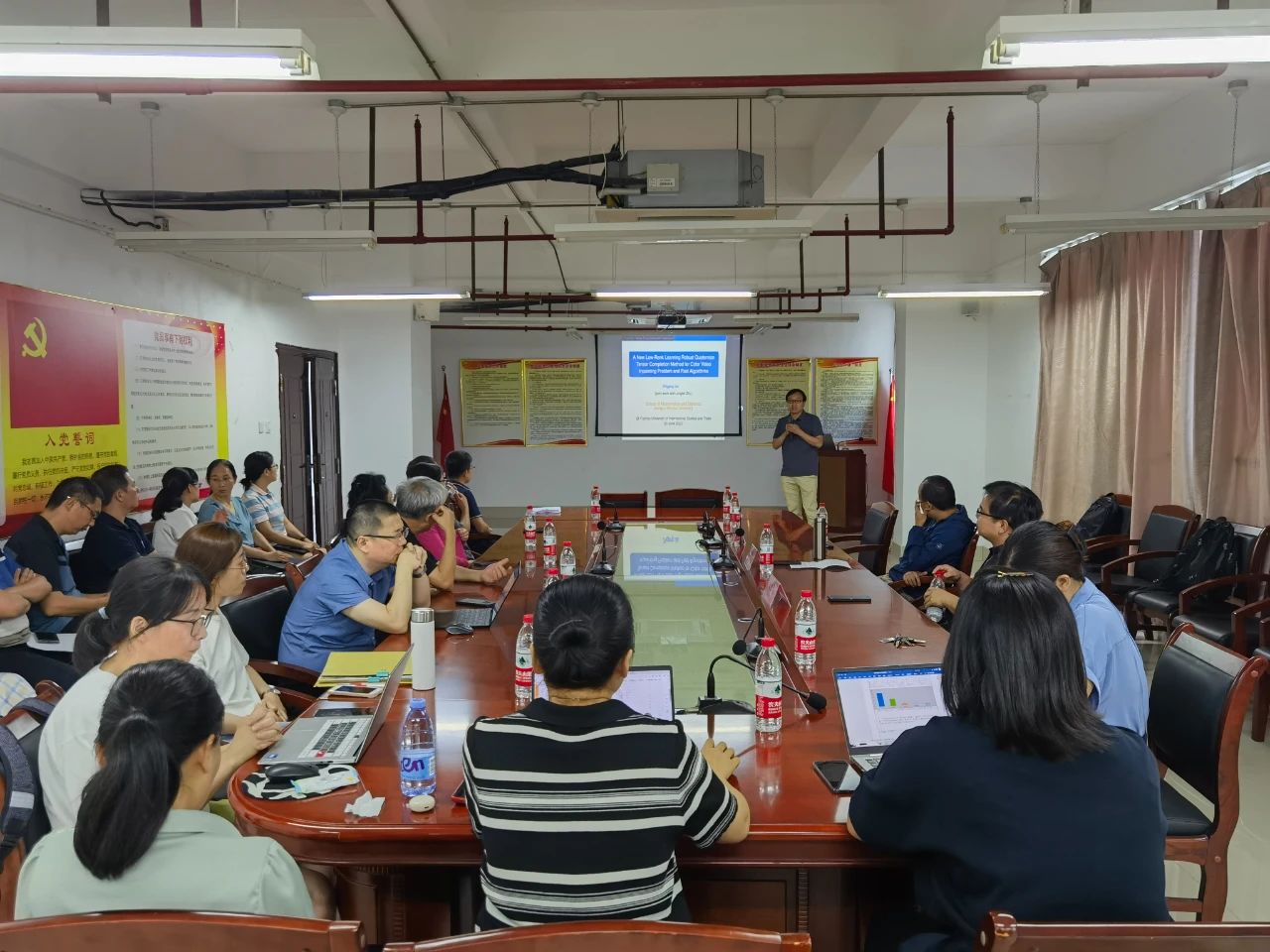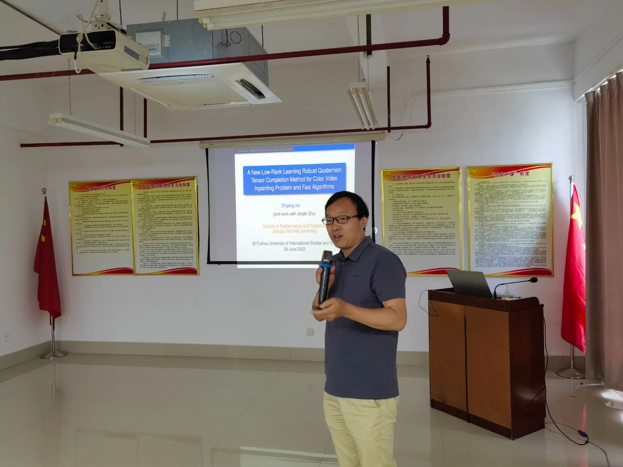 6月30日下午14:00,我院邀请江苏师范大学数学与统计学院贾志刚教授于行政A-1003室开展《彩色视频修复问题的低秩学习鲁棒四元数张量补全新方法及快速算法》专题讲座。我院全体教师参加本次讲座。讲座伊始,贾志刚教授对四元数的预备知识、QSVD以及彩色图像的表示进行了详细的介绍,并通过模型、理论与算法和数值实验进一步做出了讲解。