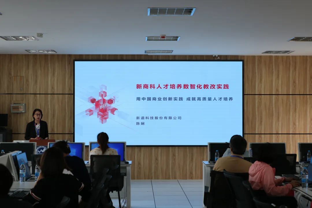 开幕式上,财务与会计学院林晓薇院长代表承办方致辞。她首先向参赛队的师生们表示热烈欢迎!接着介绍了学校、财务与会计学院以及会计国一流专业的建设历程,并指出:竞赛作为促进教学改革和课程改革的重要措施,旨在推动各院校加强校际交流,共同探讨专业内涵建设,深化教育教学改革,全面提升人才培养质量。随后,新道科技股份有限公司福建分公司副总经理陈娴作《新商科人才培养数值化教改实践-用中国商业创新实践,成就高质量人才培养》主题分享:一是新发展。二是新动能。三是新实践。随后,在选手参赛时,各高校指导教师参观新商科实验。