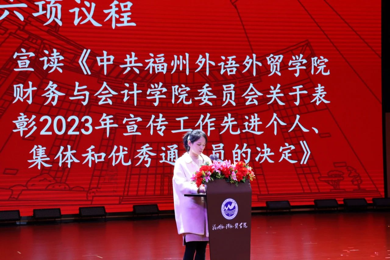 潘云燕宣读《中共福州外语外贸学院财务与会计学院委员会开元网页版表彰2023年宣传工作先进个人、集体和优秀通讯员的决定》