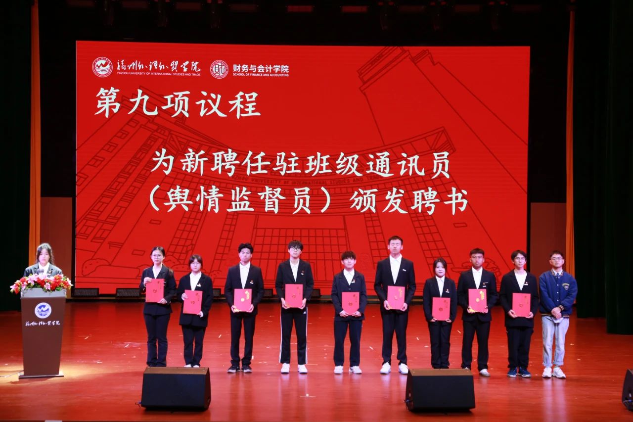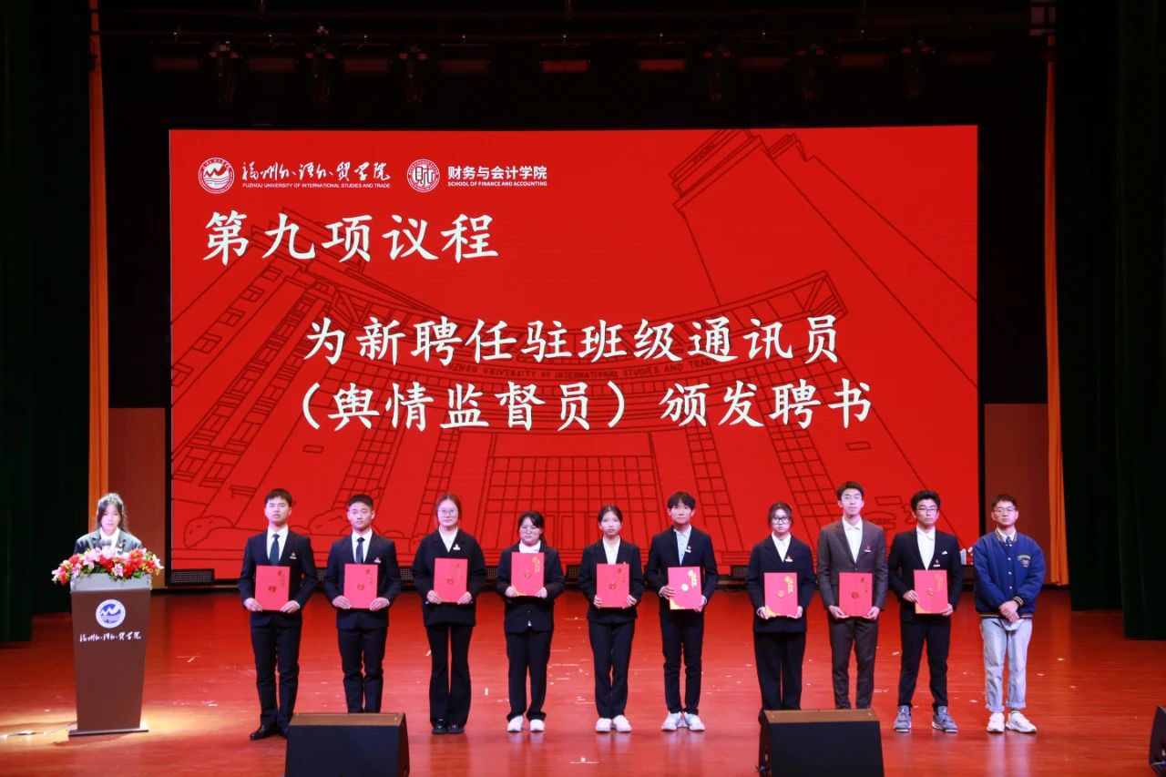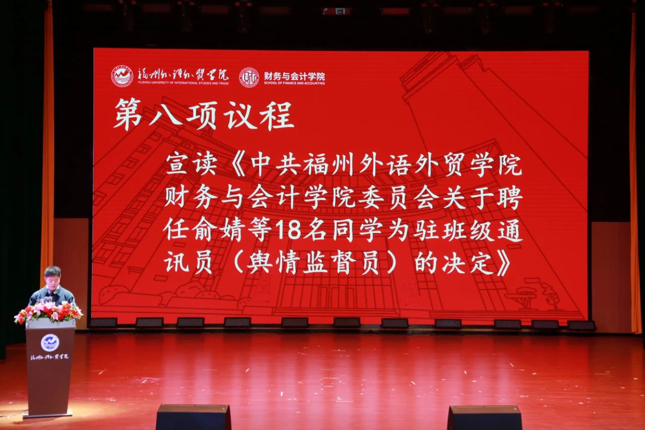 徐沛霖宣读《中共福州外语外贸学院财务与会计学院委员会开元网页版聘任俞婧等18名同学为驻班级通讯员(舆情监督员)的决定》