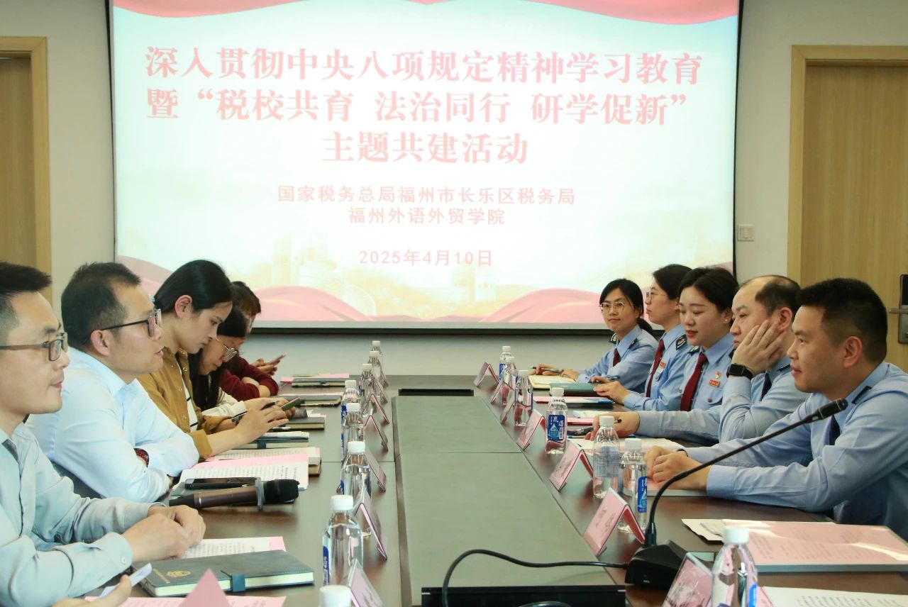 为更好地开展税收普法宣传,提高大学生税法意识,落实税校共建协议,4月10日,福州外语外贸学院财务与会计学院携手国家税务总局福州市长乐区税务局组织开展深入贯彻中央八项规定精神学习教育暨“税校共育 法治同行 研学促新”主题共建活动。长乐区税务局党委书记、局长侯毅,党委委员、副局长何伟,党委委员、副局长黄河,财务与会计学院党委书记、副院长李川以及税务干部代表、师生代表30余人参加活动。
