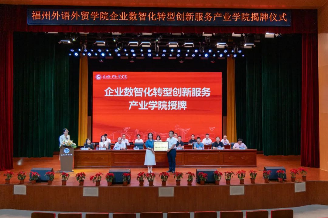 2025年6月15日,福州外语外贸学院企业数智化转型创新服务产业学院揭牌仪式在学校博雅音乐厅隆重举行。国家税务总局福州市长乐区税务局、长乐区市场监督管理局等政府单位代表,钉钉(中国)信息技术有限公司、新道科技股份有限公司等企业嘉宾,福建省纳税人服务研究会等行业专家,以及校领导、师生代表共同出席仪式。
