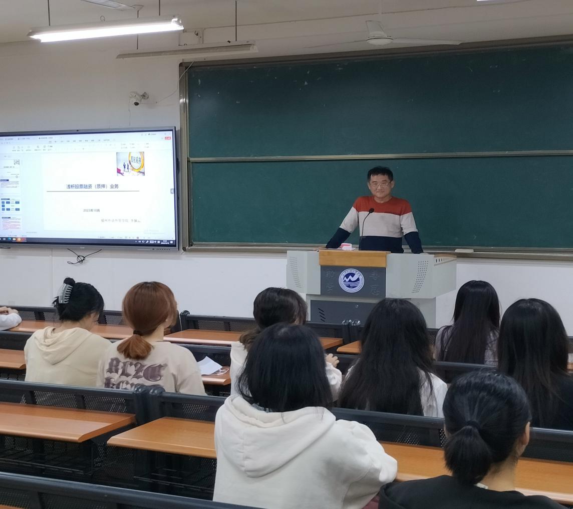 2023年10月10日下午,李佩源老师在教5102教室为2021级级财务管理(资本运营方向) 1,2,4班同学作题为"浅谈股票质押业务"的讲座。