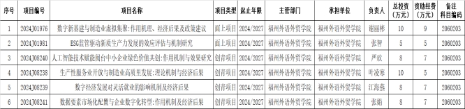 根据《福建省科学技术厅开元网页版下达2024年度省自然科学基金联合资助项目等科技项目计划和经费的通知》(闽科基〔2024〕2号),福州外语外贸学院财务与会计学院获批6项福建省自然科学基金项目、总经费40万元。
