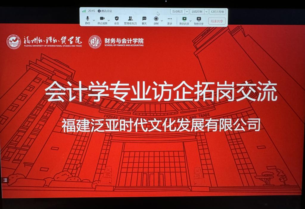 2023年9月22日,为进一步贯彻落实"访企拓岗"工作,我院会计学系谢涛老师与福建泛亚时代文化发展有限公司进行线上走访调研,并就财会领域的校企合作问题深入交流意见。